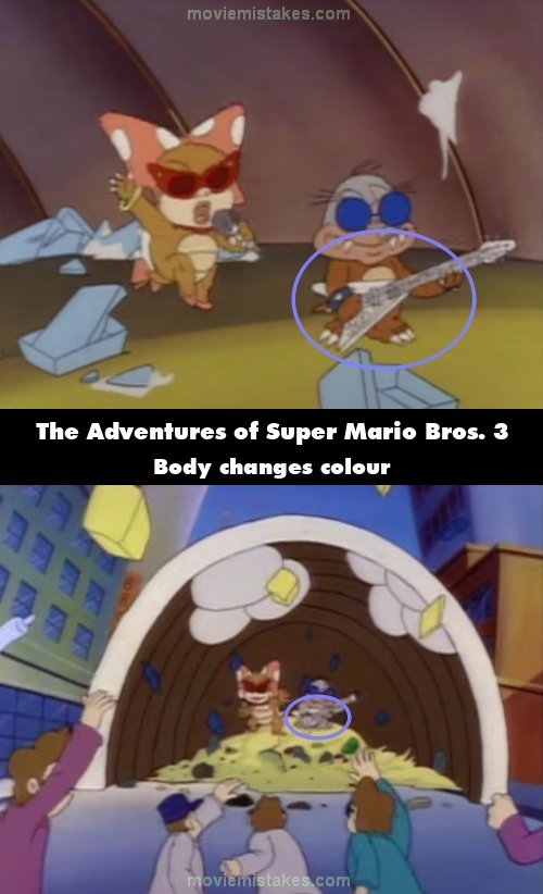 Continuity mistake: When everyone starts throwing rubbish at the Koopalings, Big Mouth's brown body turns grey like his head. (00:08:16)