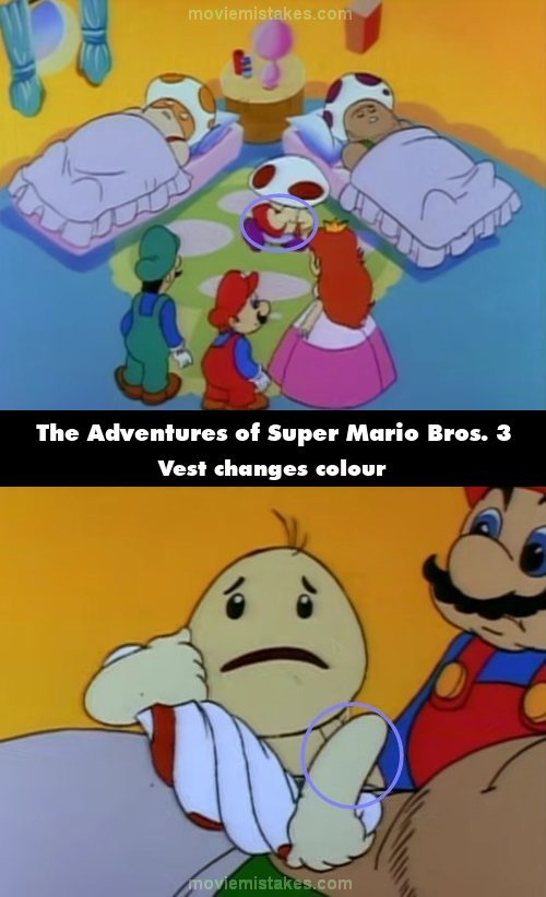 Continuity mistake: When Mario asks why Toad is crying, Toad's red vest turns the same colour as his skin. In the same shot, Mario speaks without moving his mouth, while Toad's left arm occasionally detaches from his body. (00:06:14)