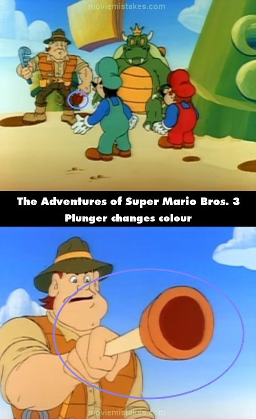 Continuity mistake: When Mighty Plumber points his plunger at Luigi, it changes from red to orange. (00:05:21)