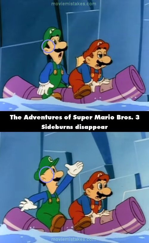 Continuity mistake: When King Koopa takes the map from Luigi for a second time, Luigi's sideburns disappear. (00:08:25)