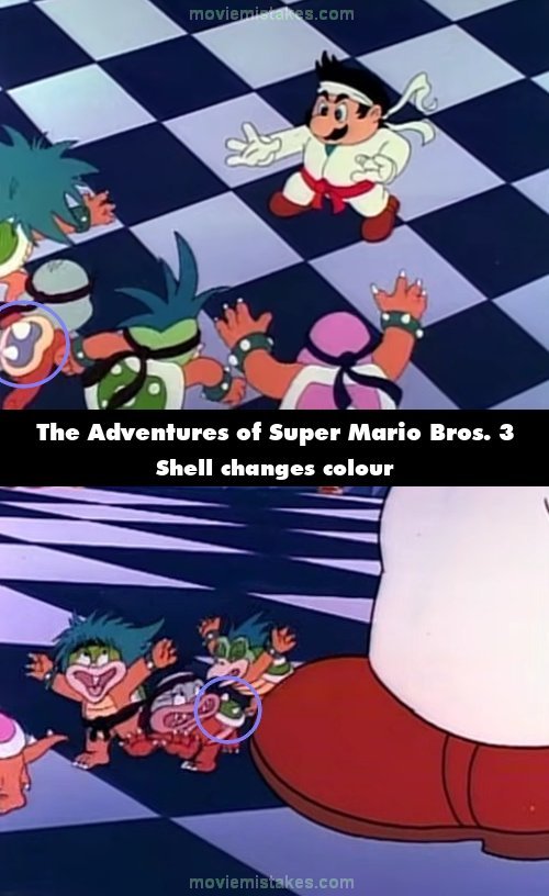 Continuity mistake: When the Koopalings run away from Mario, Bully's cream snout turns orange like his body. In the same shot, Big Mouth's purple shell turns green like Cheatsy's, while the yellow rim turns white. (00:09:54)
