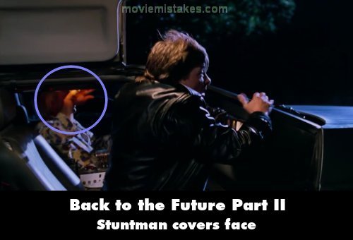 Revealing mistake: As Doc drops Marty off behind Biff's car, the camera pans across the DeLorean, and we can see Christopher Lloyd has been replaced by a stunt driver. The stuntman can be seen trying to obscure his face. (01:30:26)
