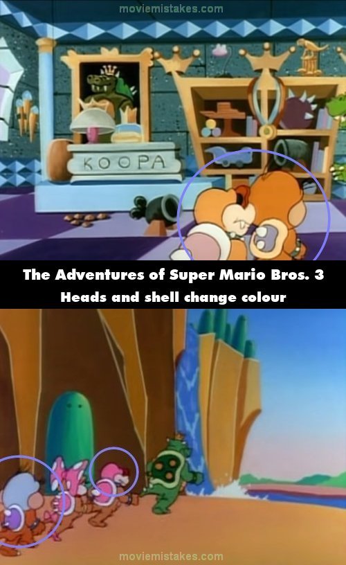 Continuity mistake: When the Koopas are chasing after the messenger, the yellow rim around Big Mouth's shell turns white. (00:02:50)