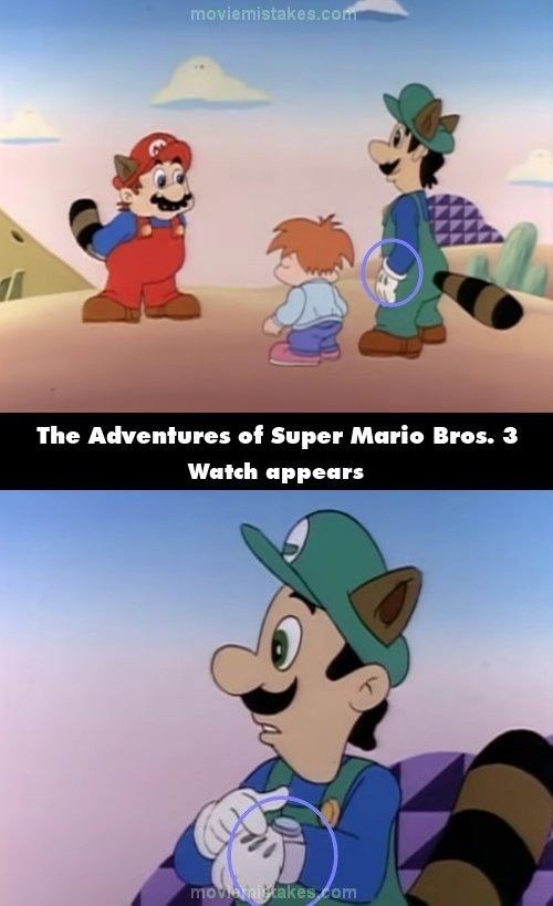 Continuity mistake: When Mario says Junior is not bad for a first-time plumber's helper, Luigi does not have a watch on, but in the next shot, one appears. (00:11:34)
