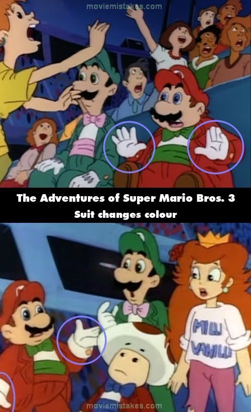 Continuity mistake: When Mario says they can save Milli Vanilli, the red linings on his suit turn white, like his gloves. (00:06:14)