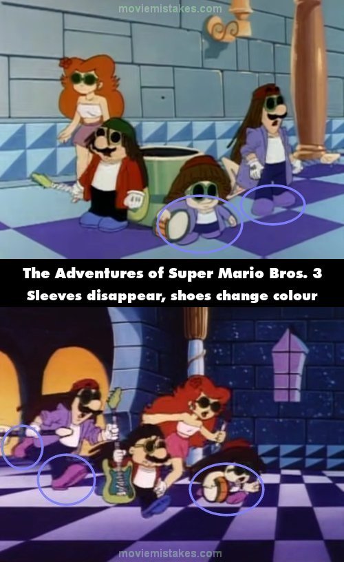 Continuity mistake: When Mario and his friends start running over to Milli Vanilli, the sleeves on Toad's shirt disappear, while his and Luigi's purple shoes turn pink. (00:09:00)