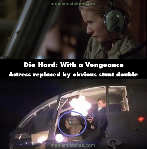Visible crew/equipment: When Simon and Katya are in the helicopter, both are replaced by obvious stunts. Simon has dyed blond hair as opposed to his brunette stunt, while she has short and straight hair, but her stunt's is long and curly.