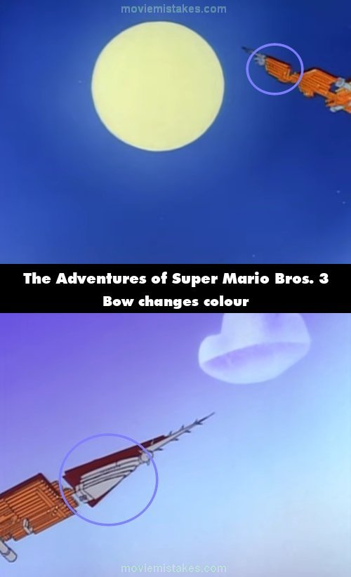 Continuity mistake: When Luigi points at the Doomship, its orange bow turns grey. (00:05:38)