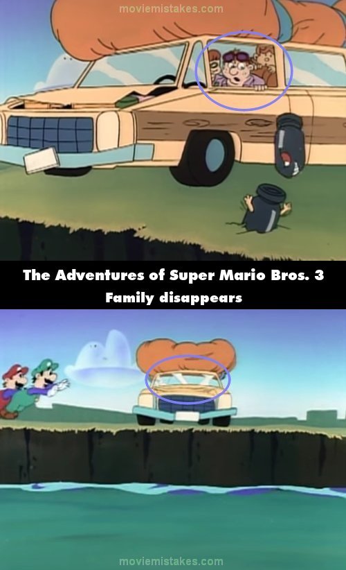 Continuity mistake: When the Mario Bros. throw the raft in the water, Norman and his family disappear, and when Mario runs behind the car, he disappears behind it. (00:06:05)