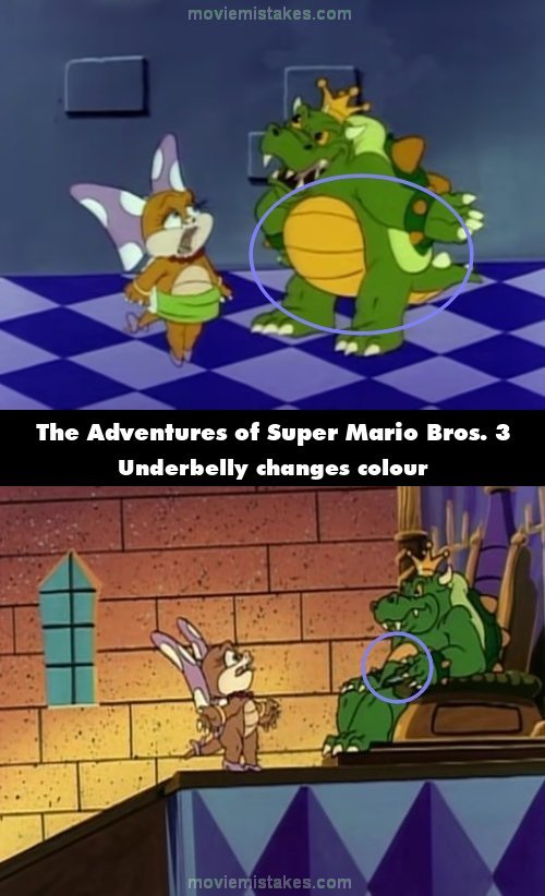 Continuity mistake: When Kootie Pie tells King Koopa the rumour, part of King Koopa's yellow underbelly turns green. (00:03:13)