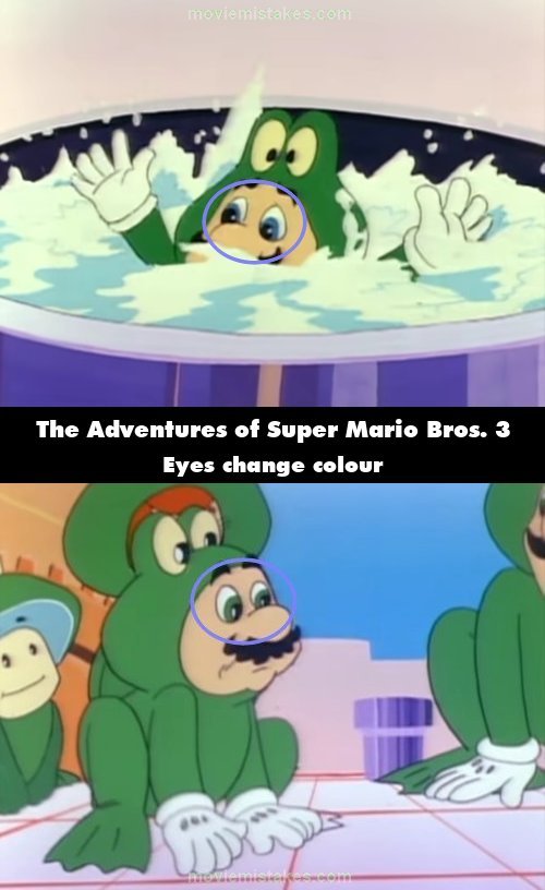 Continuity mistake: When Mario says he is afraid of the water, his blue eyes turn green like Luigi's. (00:04:57)
