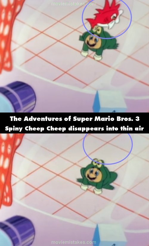 Revealing mistake: When Mario watches his friends leave, a Spiny Cheep Cheep disappears into thin air. In the same shot, Toad does not leave with Luigi and Princess Toadstool, but he is with them in the next shot. (00:07:32)