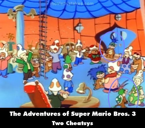 Other mistake: After the Mario Bros. realise that they have to stop the bank robbery, two Cheatsys can be seen. (00:03:57)