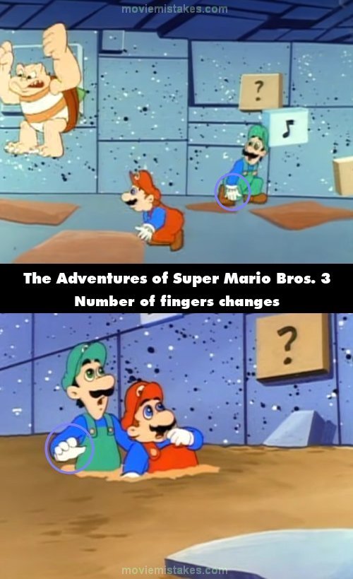 Continuity mistake: When Mario and Luigi are in the mud, the number of fingers Luigi has on each hand changes from five to four. (00:06:45)