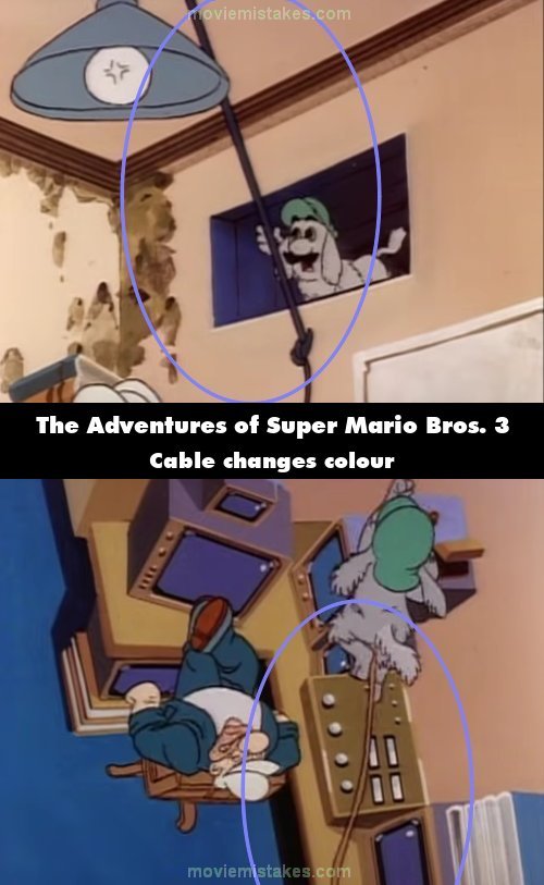 Continuity mistake: When Luigi grabs the cable, it is black, but in the next shot, it turns brown. (00:08:01)