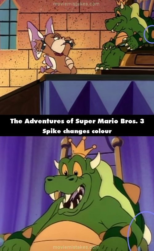 Continuity mistake: When King Koopa says they will have to stop the aliens, one of the orange spikes on his shell turns white. (00:03:27)