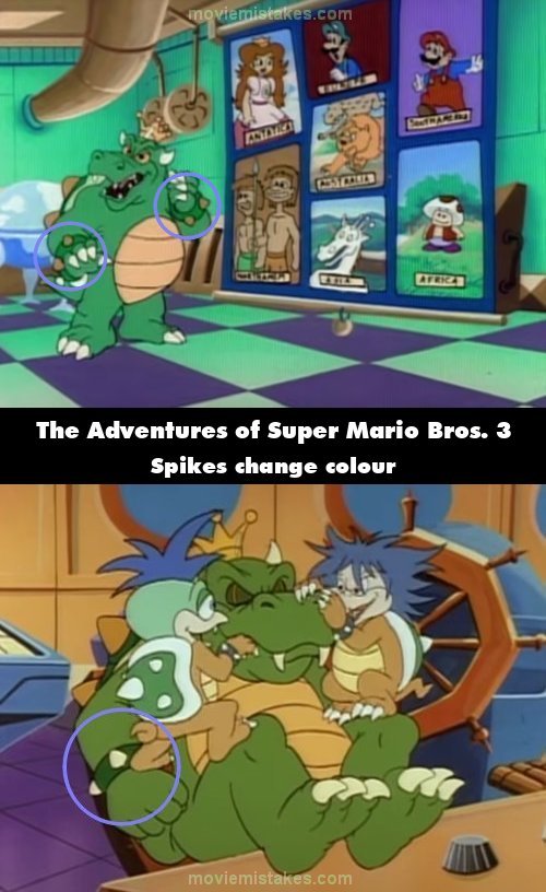 Continuity mistake: At the beginning of the episode, the orange spikes on King Koopa's shackles turn white. (00:00:51)