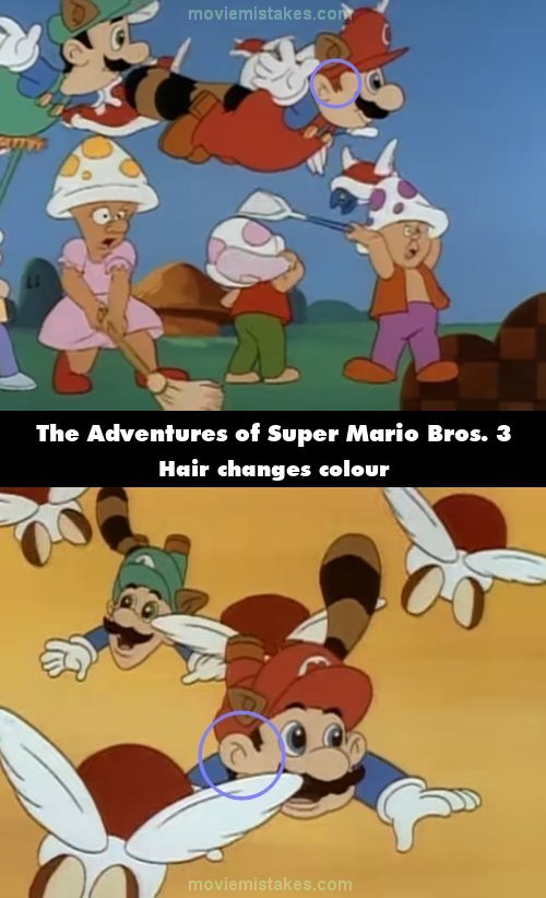 Continuity mistake: When the Mario Bros. arrive during the attack, Mario's brown sideburns turn black like Luigi's. This also happens when King Koopa's minions retreat. (00:01:54)