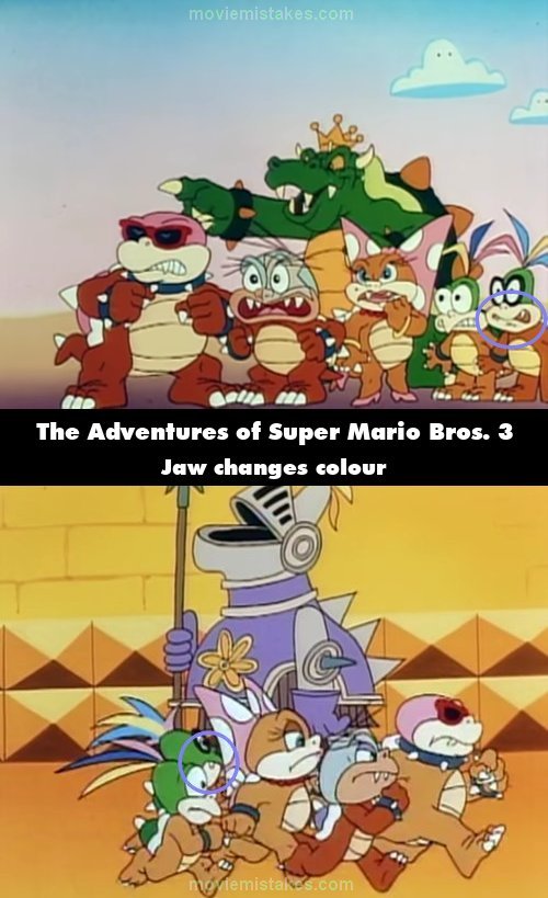 Continuity mistake: When Mario and his friends hide behind the knight, Hop's cream-coloured upper jaw turns green like his head. In the same shot, Kootie Pie's yellow bracelets turn grey like the other Koopalings' shackles. (00:02:47)