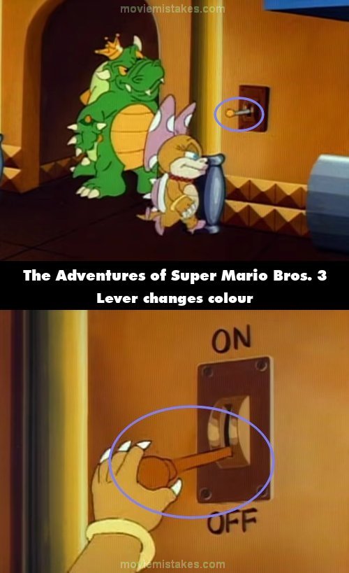 Continuity mistake: When King Koopa tells Kootie Pie to turn on the engine, the lever is yellow, but in the next shot, it turns brown. (00:09:58)