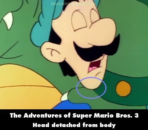 Revealing mistake: When Luigi thinks that King Koopa is joking when mentioning becoming Super Koopa, his head briefly detaches from his body. (00:02:46)
