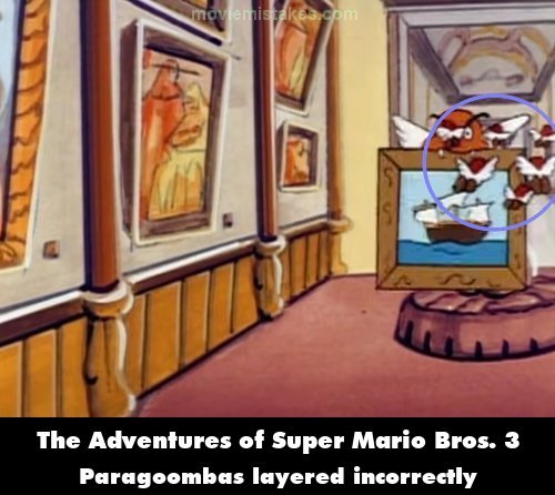 Revealing mistake: When a Paragoomba is taking away a painting, some other Paragoombas overlap on it. (00:06:08)
