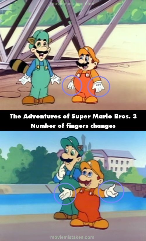 Continuity mistake: When Luigi asks if King Koopa is still in the river, the number of fingers he and his brother have on each hand changes from five to four. (00:09:19)