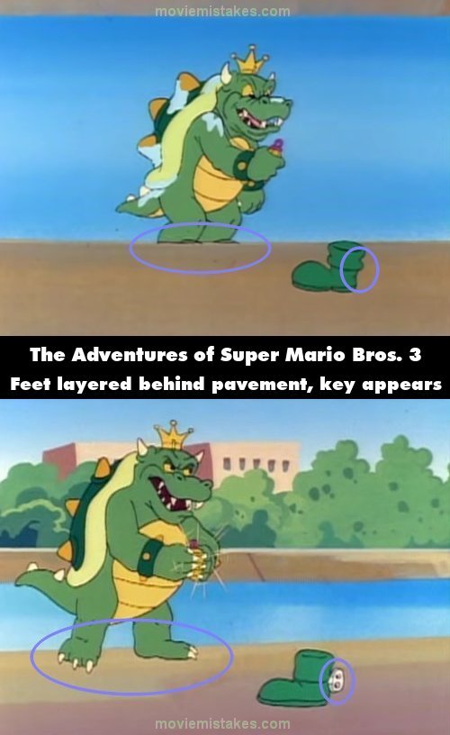 Revealing mistake: When King Koopa finds the boot, his feet are layered behind the pavement. In the same shot, the boot does not have a key, but when King Koopa uses his pendant on it, a key appears. (00:09:25)
