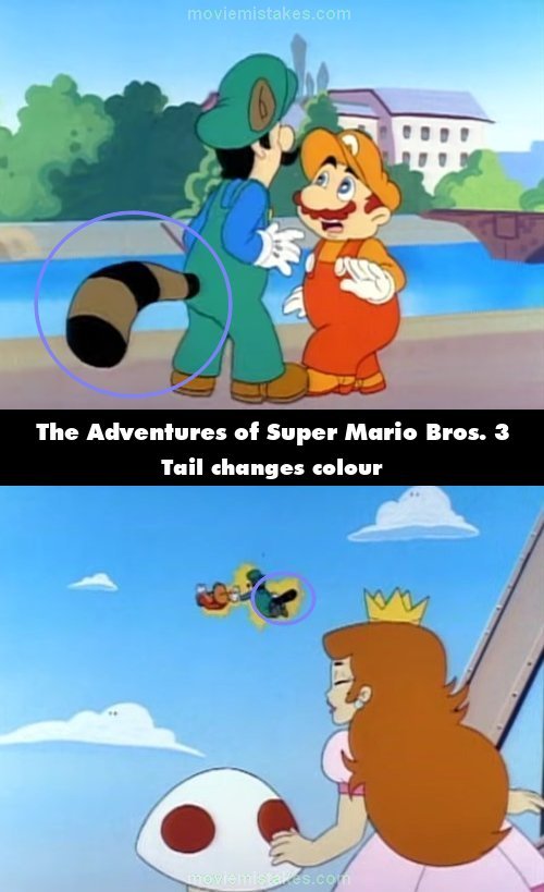 Continuity mistake: When Super Koopa first shoots a fireball at the Mario Bros., Luigi's raccoon tail turns completely black. (00:09:51)