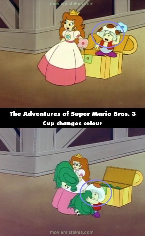 Continuity mistake: When Princess Toadstool and Toad throw the Frog Suits to the Mario Bros, the red spots on Toad's cap turn orange. (00:10:19)