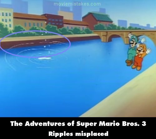 Revealing mistake: When Mario shoots a fireball at King Koopa, as he falls into the river, the ripples in the water are misplaced. (00:09:15)
