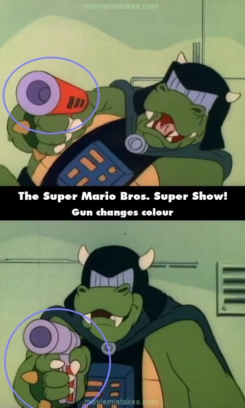 Continuity mistake: When Darth Koopa freezes Mario, his Freeze Gun is red, but when he freezes his friends, it turns grey. (00:08:21)