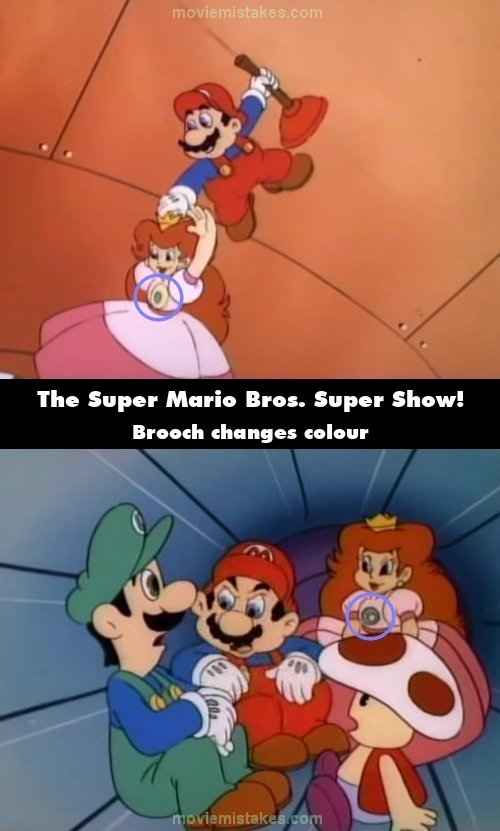 Continuity mistake: When Mario asks if his friends have their seatbelts on, Princess Toadstool's brooch changes from yellow with a blue centre to blue with a yellow centre. (00:12:01)