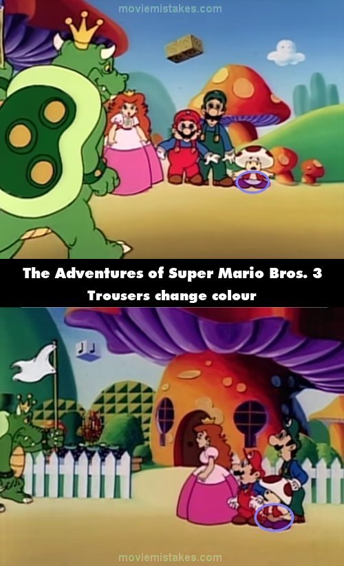 Continuity mistake: After Mario says that he is surprised that King Koopa is surrendering, Toad's blue trousers turn brown. (00:01:01)