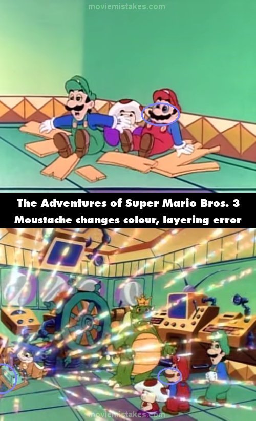 Revealing mistake: When Kooky says that he and King Koopa are travelling too far back in time, his device is layered over some controls, while Mario's black moustache briefly turns brown. (00:03:10)