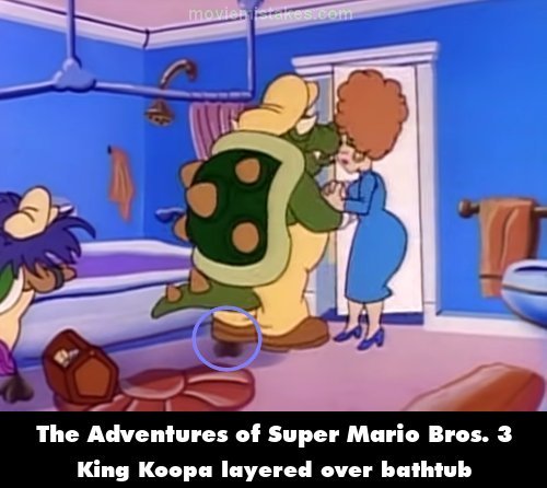 Continuity mistake: When King Koopa tells the young lady to leave the plumbing to him and Kooky, he is layered over the bathtub. (00:07:03)