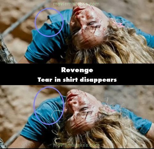Continuity mistake: When Jen is impaled on the branch and is trying to light the tree on fire, a tear can be seen in her shirt, right next to her shoulder. There is one shot where the tear disappears before reappearing again in the following shot. (00:33:35)