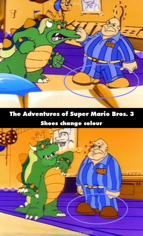 Continuity mistake: When King Koopa introduces himself, Clyde's yellow shoes turn brown. (00:02:07)