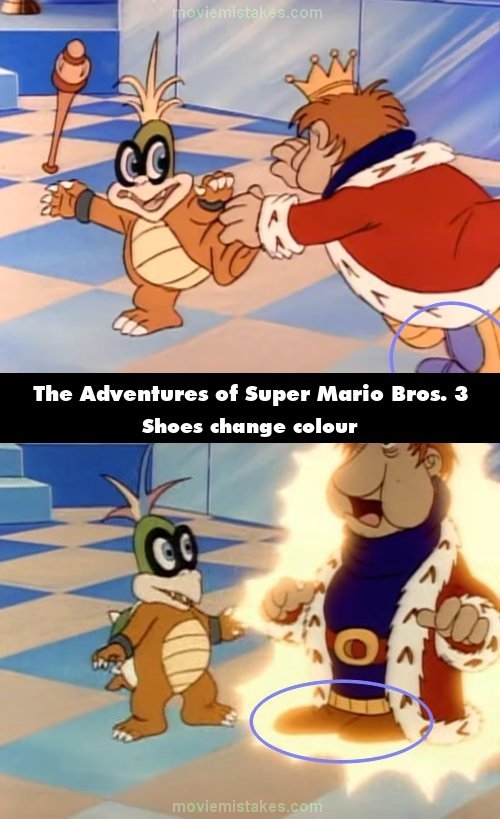 Continuity mistake: When King Windbag is turned into a dog, his purple shoes turn brown. (00:02:34)