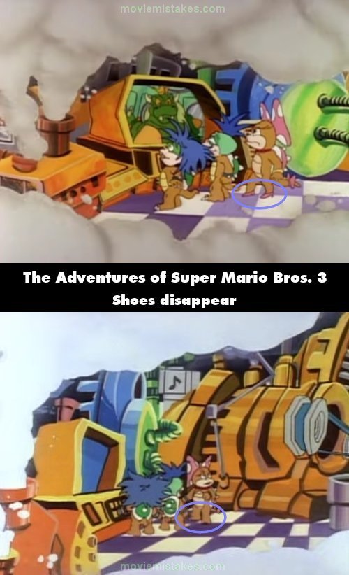 Continuity mistake: When the Koopalings look at the engine, Kootie Pie's shoes disappear. (00:01:33)