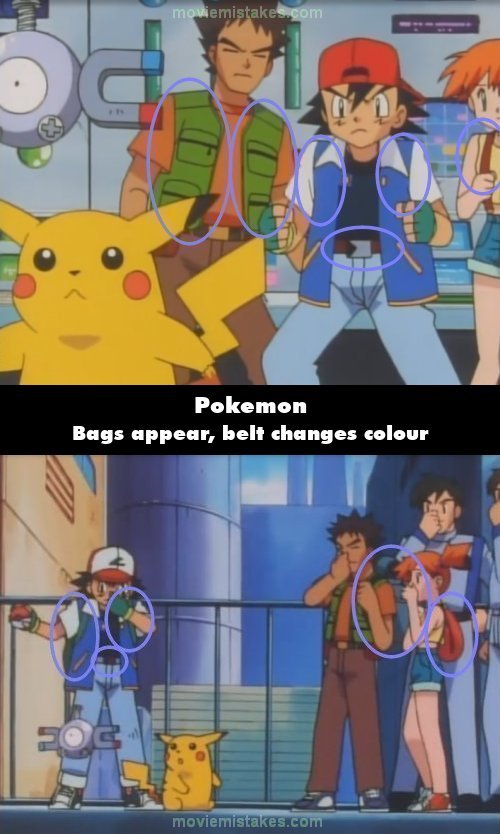 Continuity mistake: When Ash and his friends are outside the power plant near the end of the episode, they do not have their bags with them, but when Misty mentions that the Magnemite is no longer interested in Pikachu, they appear. In addition, Ash's belt changes from brown with a grey buckle to grey with a brown buckle. This also happens when they laugh after Ash mentions that the Magnemite will not follow Pikachu anymore. (00:17:37 - 00:18:22)