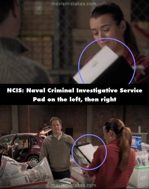 Continuity mistake: In the evidence locker, Ziva opens a folder and the white notepad is on the left-hand side. Camera changes to behind her, and now the white pad is on the right. (00:26:40)