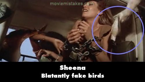 Revealing mistake: The flamingos that attack the helicopter are blatantly fake, with their necks twisting around and puppet-like eyes.