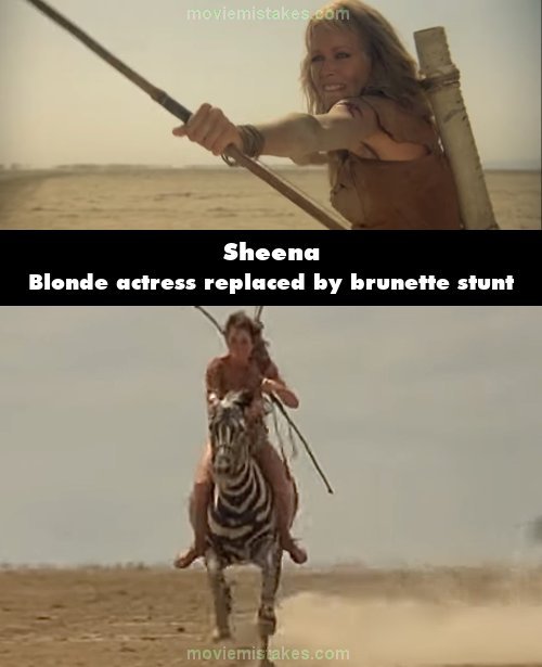 Revealing mistake: When Sheena gallops towards the prince's car, she is replaced by an obvious stunt double who not only does not resemble her but is a brunette, as opposed to blonde Sheena.