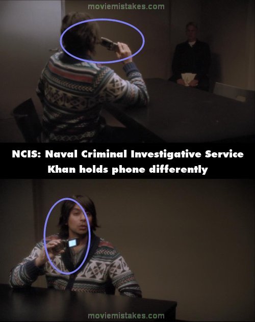 Continuity mistake: When Khan is on the phone to his lawyer, he asks Gibbs who he is and holds the phone out by his ear in the rear shot but lower in the frontal shot. (00:05:20)
