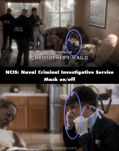 Continuity mistake: When Jimmy is talking about the smell of dead bodies, his mask is either on or off depending on the shot. (00:02:40)
