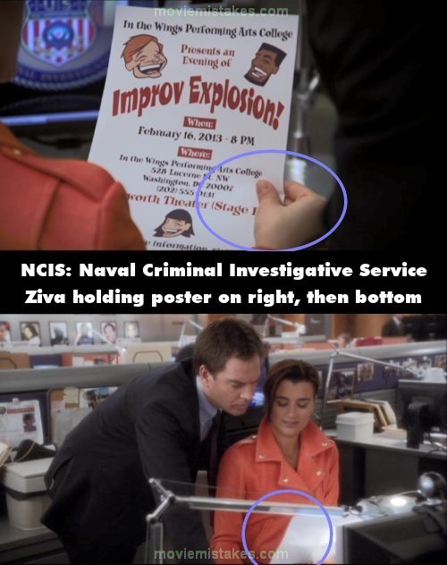 Continuity mistake: We see a close-up of Kevin's poster that Ziva is holding. In the close-up, she is holding the poster on the right-hand side. When the shot changes to a wider shot showing Ziva and Tony, Ziva is no longer holding the poster on the right-hand side, but is now holding it on the bottom. (00:04:40)