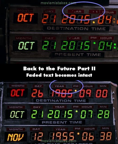 Continuity mistake: When Marty, Jennifer, and Doc head to the 2015 Hill Valley, part of the text on the dashboard is faded, but when they travel back to 1985, the text is completely intact. Additionally, in the second shot, the 'Last Time Departed' is mentioned as Nov. 12, 1955, despite it being Oct. 26, 1985. (00:38:22)