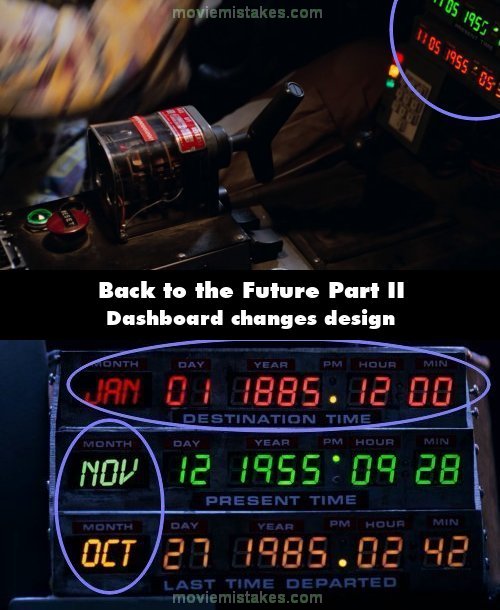 Continuity mistake: When Doc turns the time circuits on as he is about to head over to the high school, the 'Destination Time' is under 'Last Time Departed', but in the next shot, it is back to being over it like normal. It should also be noted that the month is represented by a number in the first shot, but with letters in the second. Additionally, one of the LED's is burnt out in the first, but is back to being lit in the second. (01:23:30)