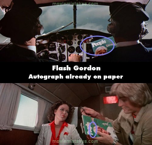 Continuity mistake: The pilot hands Flash a People magazine to sign. When Flash sits down to autograph it, one can see it's already signed (seemingly from previous takes). Then he scribbles on the same spot again.